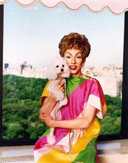 and caftan, and holding Suzanne Farrell's mother's poodle.